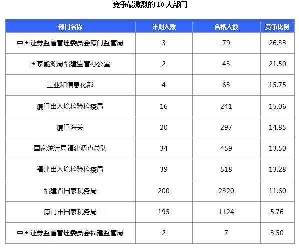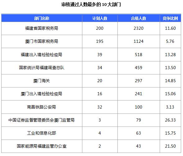 截止到17日16時,通過審核人數(shù)前三位的部門依次是:福建省國家稅務(wù)局、廈門市國家稅務(wù)局、福建出入境檢驗(yàn)檢疫局,三部門通過審核總?cè)藬?shù)達(dá)3962人,占通過審核總?cè)藬?shù)的74%。