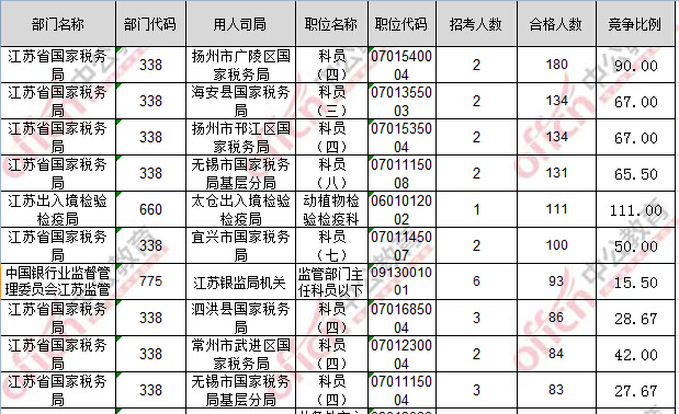 報(bào)名通過(guò)審核人數(shù)前十的職位主要集中在江蘇省國(guó)家稅務(wù)局、江蘇出入境檢驗(yàn)檢疫局,具體信息如下: