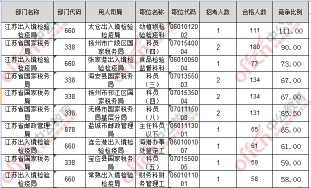 截止到17日16時(shí),競(jìng)爭(zhēng)比例的職位為江蘇出入境檢驗(yàn)檢疫局太倉(cāng)出入境檢驗(yàn)檢疫局動(dòng)植物檢驗(yàn)檢疫科進(jìn)境木材檢驗(yàn)鑒定工作科員一職,招錄1人,截止到17日16時(shí)通過(guò)人數(shù)為111人。