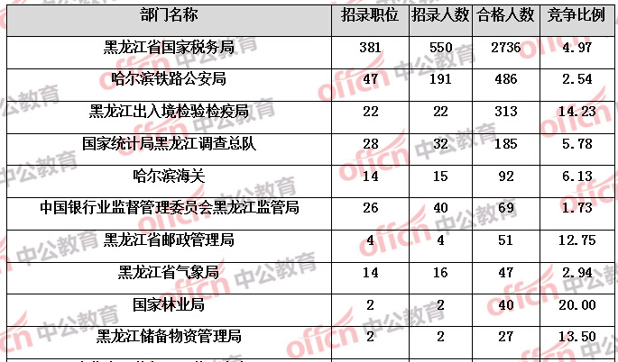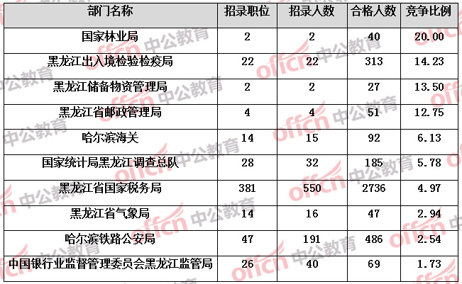 為幫助廣大考生更清晰的了解今日報名情況,黑龍江中公教育整理了審核通過人數(shù)前六位的部門以及競爭比例最激烈的六大部門,供廣大考生參考:
