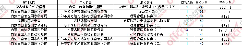 報名通過審核人數(shù)前十的職位主要集中在內(nèi)蒙古儲備物資管理局、內(nèi)蒙古固陽縣國家稅務(wù)局、內(nèi)蒙古土默特右旗國家稅務(wù)局等部門,具體信息如下: