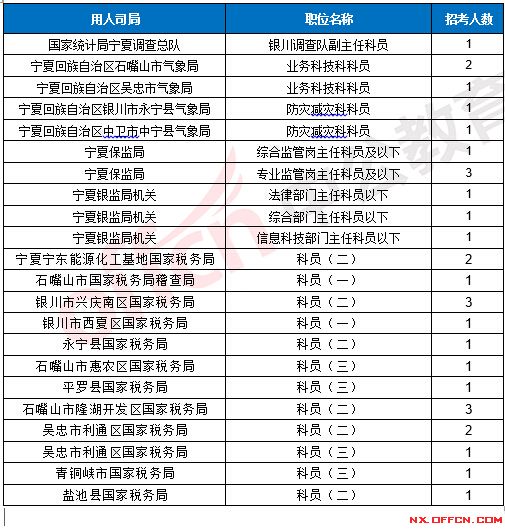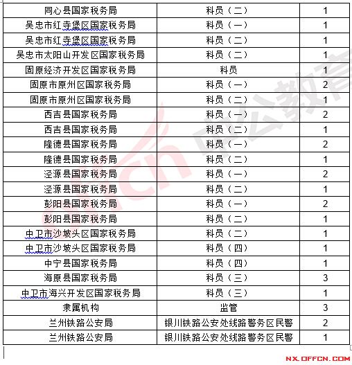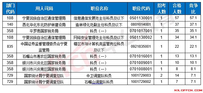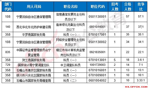 截止到17日16時,競爭比例的職位為寧夏回族自治區(qū)通信管理局信息通信發(fā)展處主任科員及以下一職,招錄1人,截止到17日16時合格人數(shù)為57人,具體信息如下: