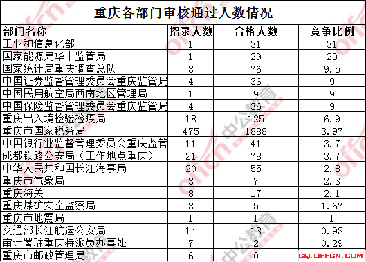截止到17日16時,各部門報名人數(shù)已陸續(xù)上漲,僅有重慶市郵政管理局無人問津,國稅局與出入境檢驗檢疫局包攬大部分報名人數(shù),截至統(tǒng)計時間:重慶市國家稅務局共報名1888人,出入境檢驗檢疫局共報名125人,兩部門合2013人,共占了總報名人數(shù)的82%!