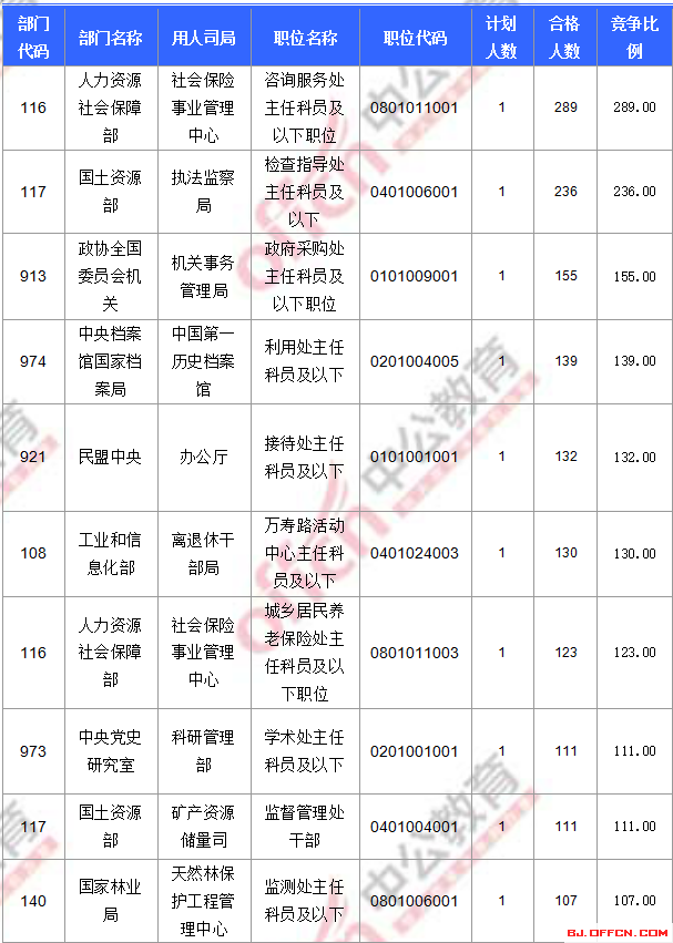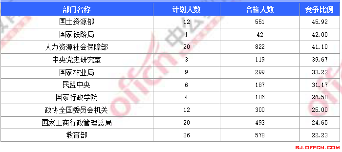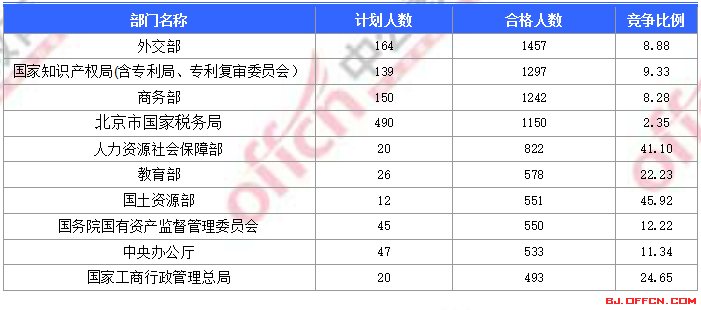 為幫助廣大考生更清晰的了解今日報名情況,北京中公網(wǎng)校整理了合格人數(shù)前十位的部門以及競爭比例最激烈的十大部門,供廣大考生參考: