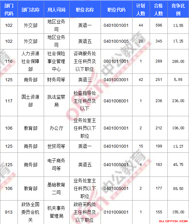 合格人數(shù)前十的職位主要集中在外交部、人力資源社會部、商務(wù)部等部門,具體信息如下:
