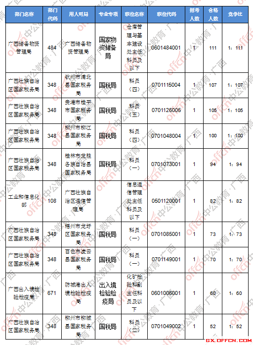 截止到18日8時(shí),工作地點(diǎn)在廣西的職位共有128個(gè)無人報(bào)考,占全部職位的19.9%。下面是部分廣西無人報(bào)考職位一覽表,更多無人報(bào)考職位詳情請(qǐng)下載附件,廣西中公網(wǎng)校專家建議廣大考生結(jié)合自身?xiàng)l件,根據(jù)自己的實(shí)際情況找到屬于自己的職位,避免激烈競(jìng)爭(zhēng)。