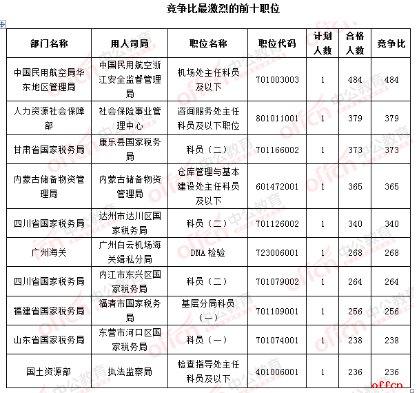 從前十名來看,排名也有一些調(diào)整,廣州海關(guān)廣州白云機(jī)場海關(guān)緝私分局DNA檢驗職位(職位代碼723006001)和國土資源部執(zhí)法監(jiān)察局檢查指導(dǎo)處主任科員及以下職位(職位代碼401006001)進(jìn)入前十行列競爭比分別為238:1、236:1。