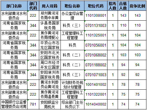 截止18日8時(shí),招錄比例的職位為鄭州黃河河務(wù)局中牟黃河河務(wù)局辦公室綜合管理一職,招錄1人,截止18日8時(shí)通過人數(shù)為143人。