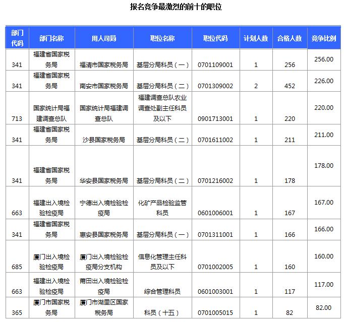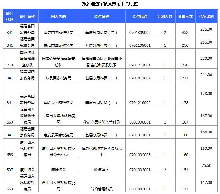 報(bào)名通過審核人數(shù)前十的職位主要集中在南安市國(guó)家稅務(wù)局、福清市國(guó)家稅務(wù)局、國(guó)家統(tǒng)計(jì)局福建調(diào)查總隊(duì)等部門,具體信息如下: