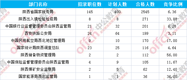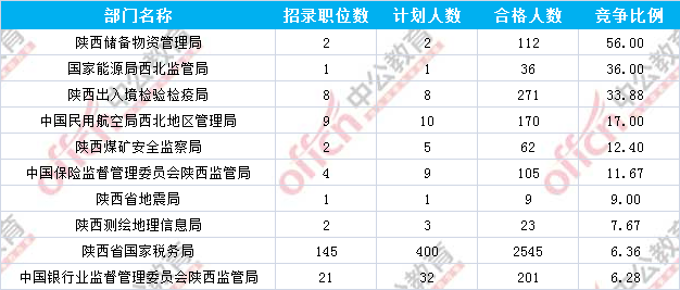 為幫助廣大考生更清晰的了解今日報(bào)名情況,陜西中公網(wǎng)校整理了審核通過人數(shù)前十位的部門以及競爭比例最激烈的十大部門,供廣大考生參考: