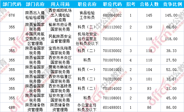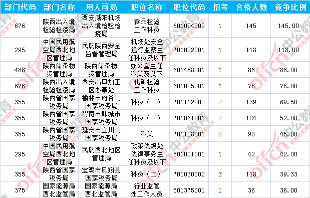 報(bào)名通過審核人數(shù)前十的職位主要集中在陜西出入境檢驗(yàn)檢疫局、陜西省國家稅務(wù)局、中國民用航空局西北地區(qū)管理局等部門,具體信息如下:中公提供數(shù)據(jù)