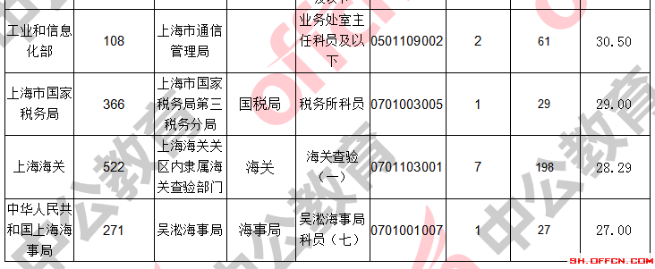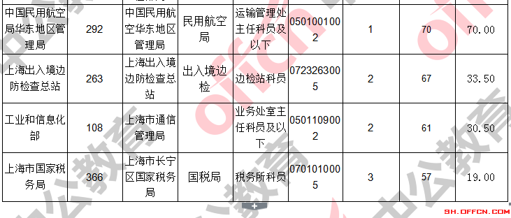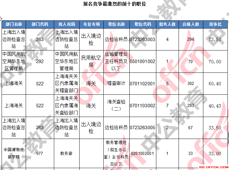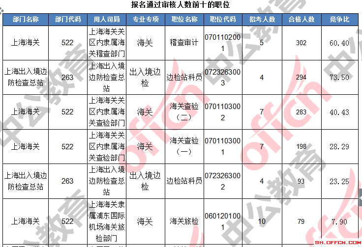 報(bào)名通過(guò)審核人數(shù)前十的職位主要集中在上海出上海海關(guān)、上海出入境邊防檢查總站、中國(guó)民用航空局華東地區(qū)管理局,具體信息如下: