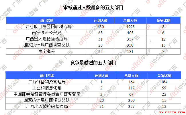 為幫助廣大考生更清晰的了解今日?qǐng)?bào)名情況,廣西中公網(wǎng)校整理了審核通過人數(shù)前五位的部門以及競(jìng)爭(zhēng)比例最激烈的五大部門,供廣大考生參考: