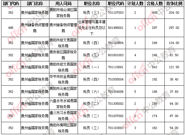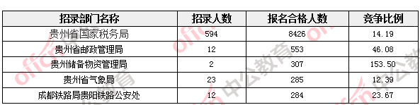 報名通過審核人數(shù)較多的職位主要集中在貴州省國家稅務局、貴州儲備物資管理局兩大部門,具體信息如下: