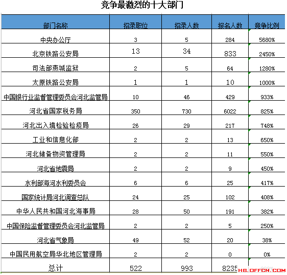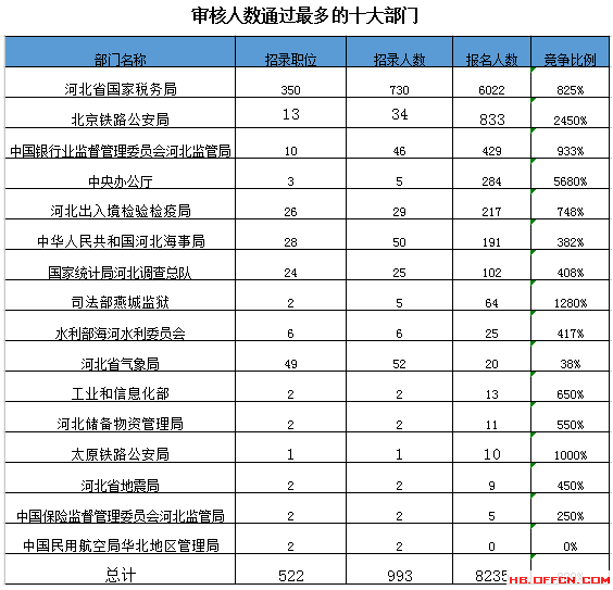 截止到18日16時(shí),通過審核人數(shù)前三位的部門依次是:河北省國家稅務(wù)局、北京鐵路公安局、中國銀行業(yè)監(jiān)督管理委員會(huì)河北監(jiān)管局,三部門通過審核總?cè)藬?shù)達(dá)7284人,占通過審核總?cè)藬?shù)的88%。