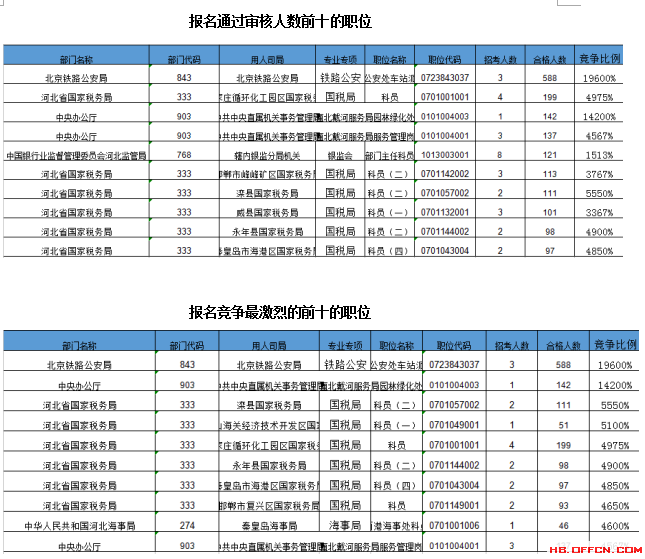 報(bào)名通過審核人數(shù)前十的職位主要集中在北京鐵路公安局、河北省國家稅務(wù)局、中國銀行業(yè)監(jiān)督管理委員會(huì)河北監(jiān)管局等部門,具體信息如下: