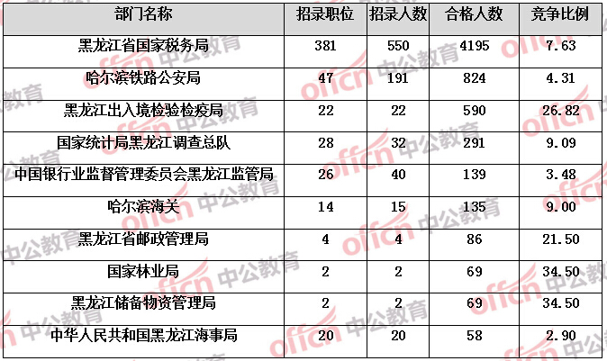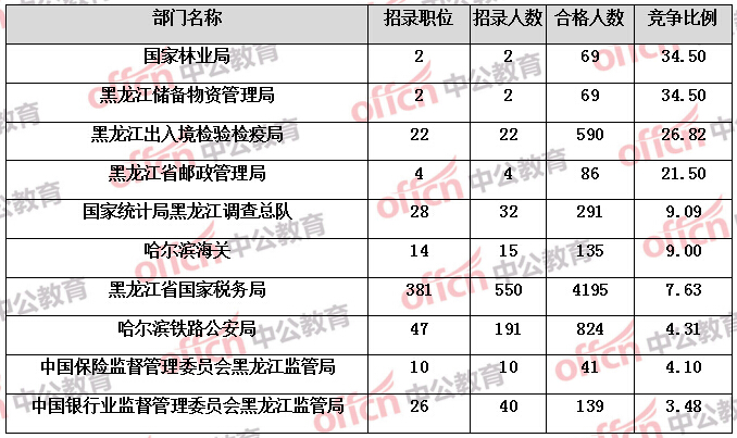 為幫助廣大考生更清晰的了解今日?qǐng)?bào)名情況,黑龍江中公教育整理了審核通過(guò)人數(shù)前六位的部門(mén)以及競(jìng)爭(zhēng)比例最激烈的十大部門(mén),供廣大考生參考: