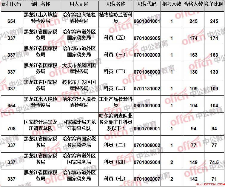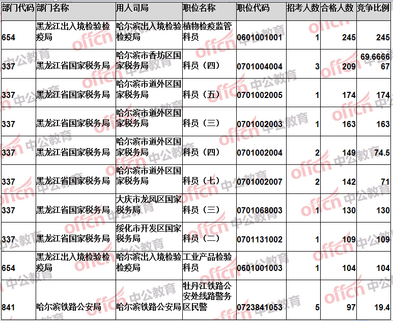 報(bào)名通過(guò)審核人數(shù)前十的職位主要集中在黑龍江省國(guó)家稅務(wù)局、黑龍江出入境檢驗(yàn)檢疫局、哈爾濱鐵路公安局等部門(mén),具體信息如下: