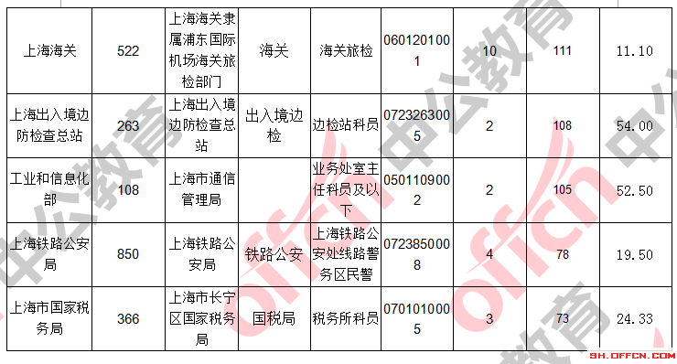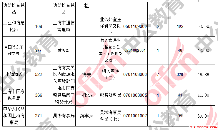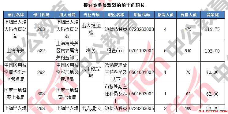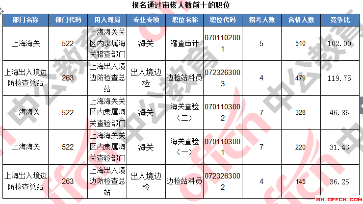 報(bào)名通過審核人數(shù)前十的職位主要集中在上海出上海海關(guān)、上海出入境邊防檢查總站、工業(yè)和信息化部,具體信息如下: