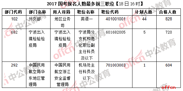 在報(bào)名人數(shù)最多前三職位中,中國民用航空局華東地區(qū)管理局中國民用航空浙江安全監(jiān)督管理局機(jī)場(chǎng)處主任科員及以下(職位代碼701003003)取代昨日的福建省南安市國家稅務(wù)局基層分局科員二這一職位,躋身前三甲,實(shí)力不容小覷。