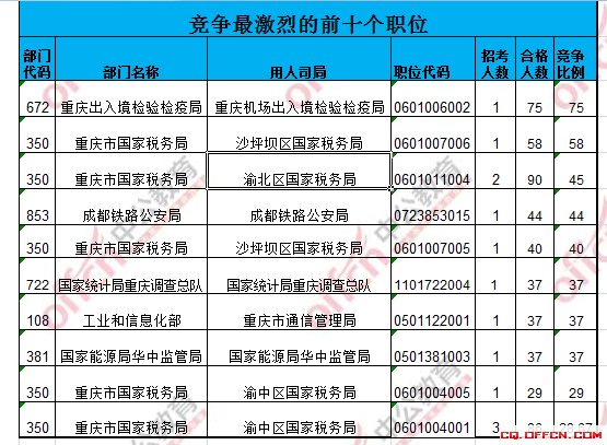 截止到18日16時(shí),競(jìng)爭(zhēng)比例的職位為‘重慶機(jī)場(chǎng)出入境檢驗(yàn)檢疫局’一職,招錄1人,截止到18日8時(shí)通過(guò)人數(shù)為75人。但是還有少數(shù)崗位沒(méi)有人去報(bào)名。