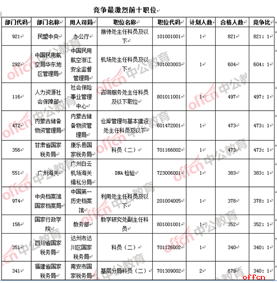 從競(jìng)爭(zhēng)比上來(lái)看,5個(gè)職位的競(jìng)爭(zhēng)比在473:1以上,除坐“頭把交椅”的民盟中央實(shí)現(xiàn)破八百大關(guān)之外,中國(guó)民用航空局華東地區(qū)管理局中國(guó)民用航空浙江安全監(jiān)督管理局機(jī)場(chǎng)處主任科員及以下(職位代碼701003003)一職的報(bào)名人數(shù)與昨日下午沒(méi)有變化,仍保持604:1的記錄,但這并不表示,此職位今后沒(méi)有新報(bào)考者的加入,很有可能是審核人員沒(méi)有對(duì)此職位進(jìn)行審核。競(jìng)爭(zhēng)最激烈排行榜中的第三名,與并列名次的第四和第五名,距離500:1的大關(guān)一步之遙,中公網(wǎng)校專(zhuān)家預(yù)計(jì),今日這三個(gè)職位仍會(huì)保持強(qiáng)勁前進(jìn)勢(shì)頭。