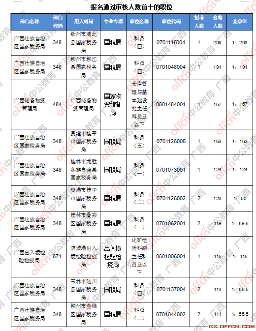 報名通過審核人數(shù)前十的職位主要集中在廣西壯族自治區(qū)國家稅務局、廣西儲備物資管理局、廣西出入境檢驗檢疫局等部門,具體信息如下: