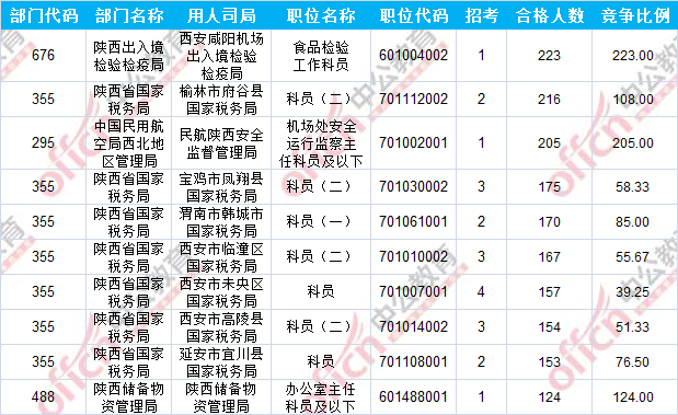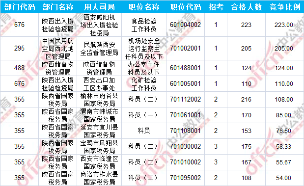 報(bào)名通過審核人數(shù)前十的職位主要集中在陜西出入境檢驗(yàn)檢疫局、陜西省國家稅務(wù)局、中國民用航空局西北地區(qū)管理局等部門,具體信息如下: