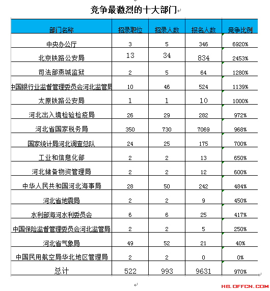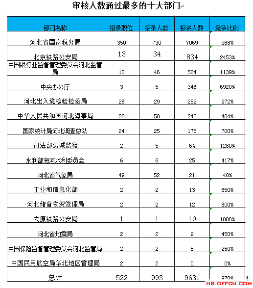 為幫助廣大考生更清晰的了解今日報(bào)名情況,河北中公網(wǎng)校整理了審核通過人數(shù)前十位的部門以及競爭比例最激烈的十大部門,供廣大考生參考: