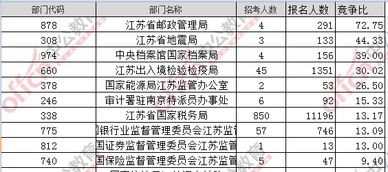 截止到19日16時,通過審核人數(shù)前三位的部門依次是:江蘇省國家稅務(wù)局、江蘇出入境檢驗檢疫局、中國銀行業(yè)監(jiān)督管理委員會江蘇監(jiān)管局,三部門通過審核總?cè)藬?shù)達13293人,占通過審核總?cè)藬?shù)的88%。