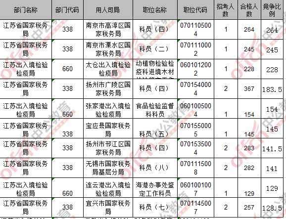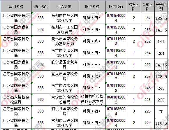 報名通過審核人數(shù)前十的職位主要集中在江蘇省國家稅務局、江蘇出入境檢驗檢疫局,具體信息如下: