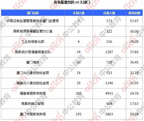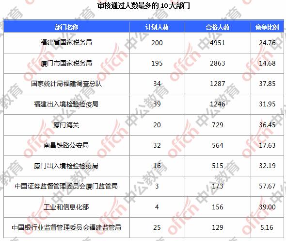 為幫助廣大考生更清晰的了解今日?qǐng)?bào)名情況,福建中公網(wǎng)校整理了審核通過(guò)人數(shù)前10位的部門(mén)以及競(jìng)爭(zhēng)比例最激烈的10大部門(mén),供廣大考生參考: