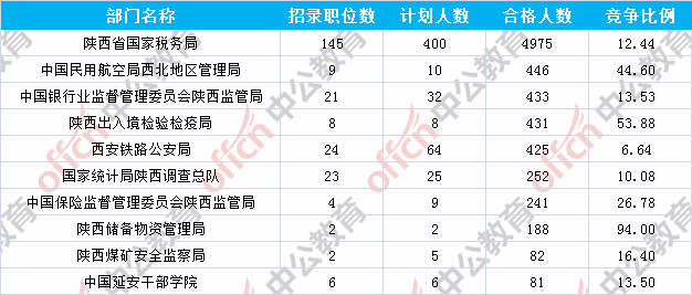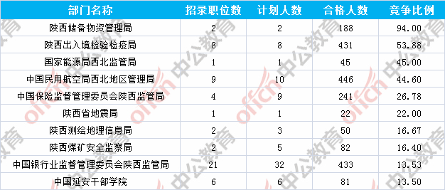 為幫助廣大考生更清晰的了解今日報名情況,陜西中公網(wǎng)校整理了審核通過人數(shù)前十位的部門以及競爭比例最激烈的十大部門,供廣大考生參考: