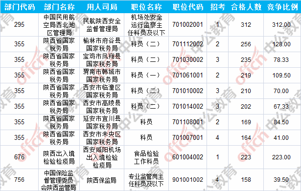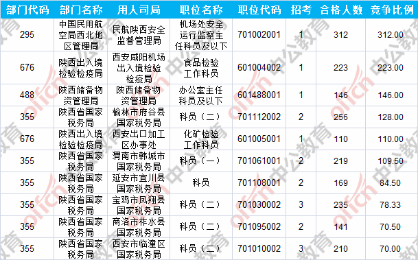 報(bào)名通過(guò)審核人數(shù)前十的職位主要集中在陜西出入境檢驗(yàn)檢疫局、陜西省國(guó)家稅務(wù)局、中國(guó)民用航空局西北地區(qū)管理局等部門(mén),具體信息如下: