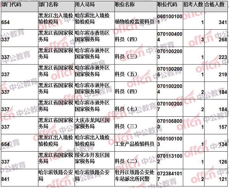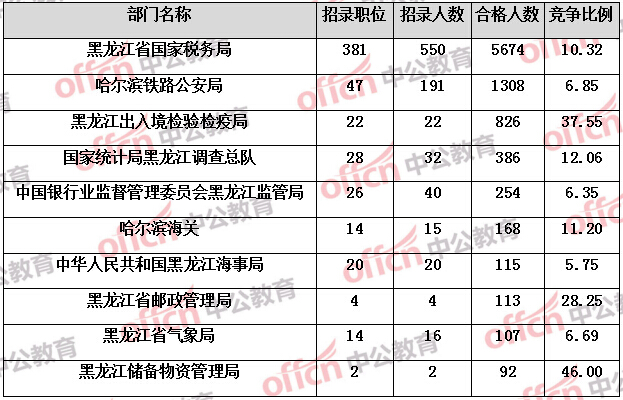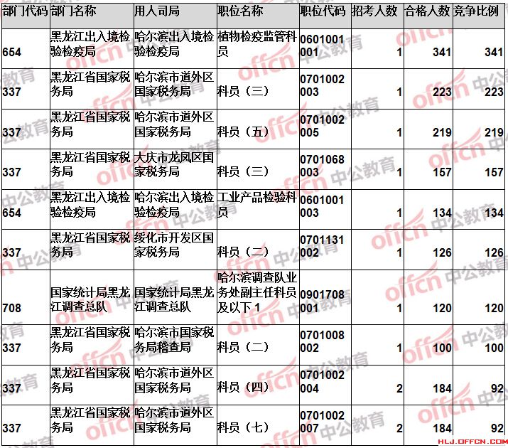 報名通過審核人數(shù)前十的職位主要集中在黑龍江省國家稅務(wù)局、黑龍江出入境檢驗檢疫局、哈爾濱鐵路公安局等部門,具體信息如下: