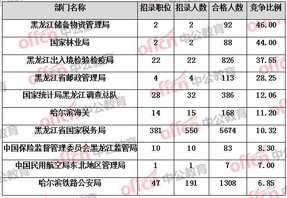 為幫助廣大考生更清晰的了解今日報名情況,黑龍江中公網(wǎng)校整理了審核通過人數(shù)前六位的部門以及競爭比例最激烈的十大部門,供廣大考生參考: