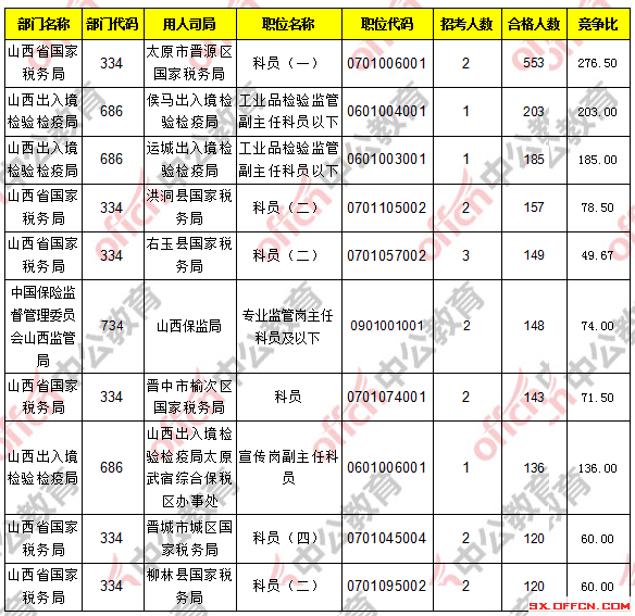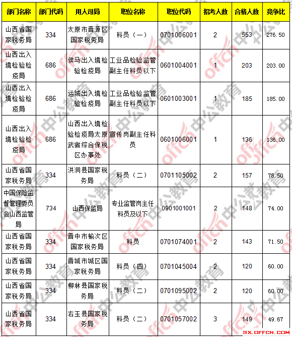 報(bào)考人數(shù)前十的職位主要集中在山西省國(guó)家稅務(wù)局、山西出入境檢驗(yàn)檢疫局這兩個(gè)部門,具體信息如下: