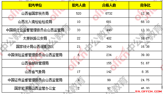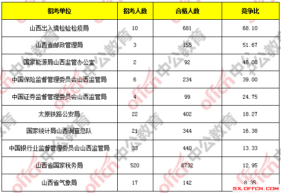 為幫助廣大考生更清晰的了解今日?qǐng)?bào)名情況,山西中公網(wǎng)校整理了合格人數(shù)前十位的部門以及競(jìng)爭(zhēng)比例最激烈的十大部門,供廣大考生參考: