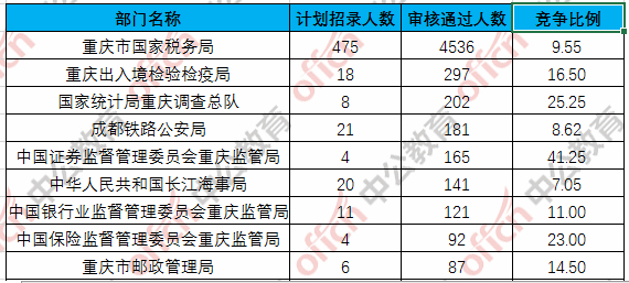 為幫助廣大考生更清晰的了解今日報(bào)名情況,重慶中公網(wǎng)校整理了合格人數(shù)前十位的部門以及競爭比例最激烈的十大部門,供廣大考生參考: