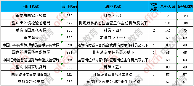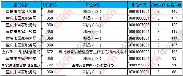 合格人數(shù)前十的職位主要集中在重慶市國(guó)家稅務(wù)局、重慶出入境檢驗(yàn)檢疫局、國(guó)家統(tǒng)計(jì)局重慶調(diào)查總隊(duì)等部門(mén),具體信息如下:
