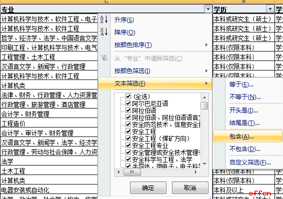在“專業(yè)”一項(xiàng)中點(diǎn)擊下拉菜單,選擇“文本篩選”,選擇“包含”一項(xiàng)。