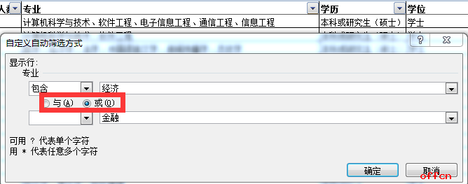 中公網(wǎng)校專家提醒考生,在文本篩選中要嚴(yán)格區(qū)分“與”與“或”兩個(gè)篩選條件的區(qū)別,“與”的篩選條件是“兩者全包括”,而“或”的篩選條件是“兩者任一或全部均可”。 例如:我們篩選“經(jīng)濟(jì)金融”的專業(yè),如下圖: