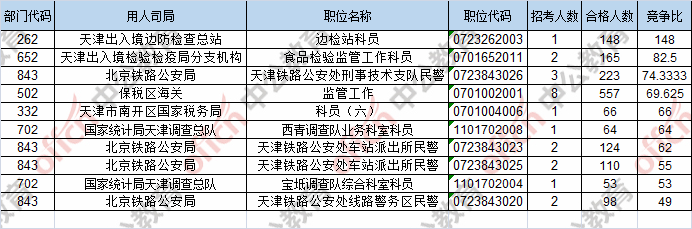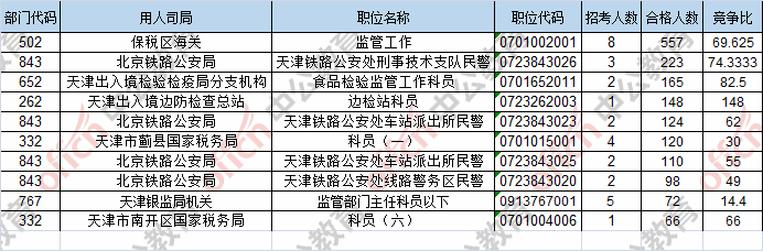 報(bào)名通過(guò)審核人數(shù)前十的職位主要集中在保稅區(qū)海關(guān)、北京鐵路公安局、天津出入境檢驗(yàn)檢疫局分支機(jī)構(gòu),具體信息如下: