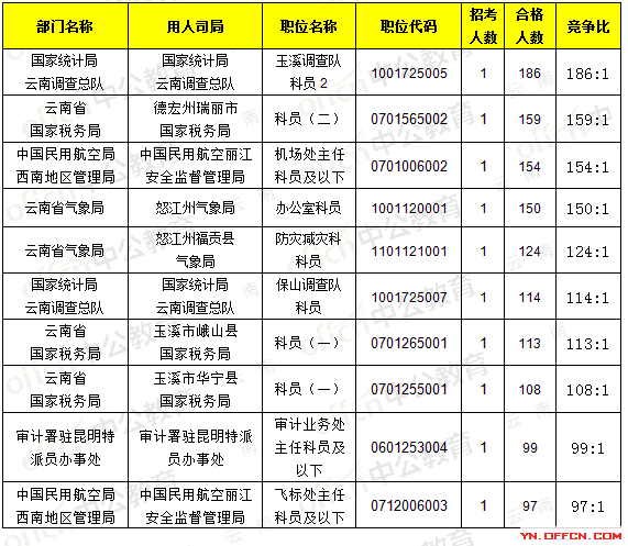 截止20日8時(shí),招錄比例的職位為國家統(tǒng)計(jì)局云南調(diào)查總隊(duì),職位代碼是1001725005,招錄7人,通過人數(shù)404人,競(jìng)爭(zhēng)比186:1