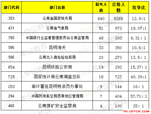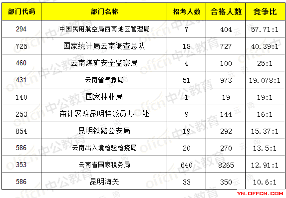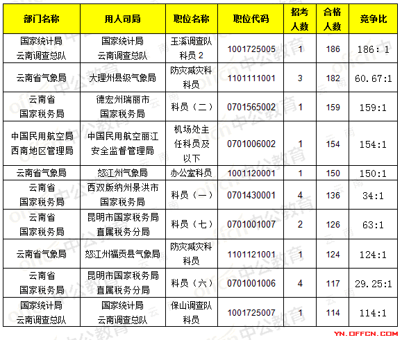 報(bào)名通過審核人數(shù)前十的職位主要集中在云南省氣象局、云南省國家稅務(wù)局、國家統(tǒng)計(jì)局云南調(diào)查總隊(duì),具體信息如下: