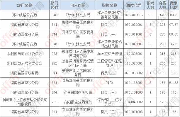報名通過審核人數(shù)排名前列的職位主要集中在鄭州鐵路公安局、河南省國家稅務局,水利部黃河水利委員會,具體信息如下: