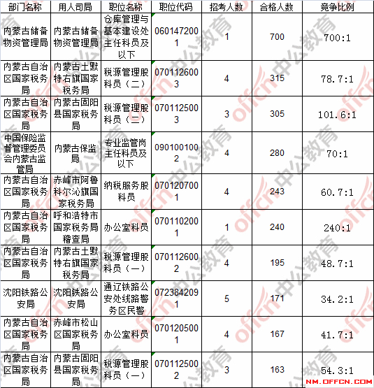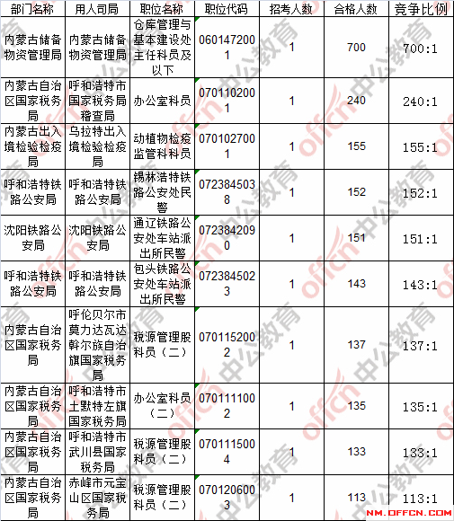 報(bào)名通過審核人數(shù)前十的職位主要集中在內(nèi)蒙古儲(chǔ)備物資管理局、內(nèi)蒙古固陽縣國家稅務(wù)局、內(nèi)蒙古土默特右旗國家稅務(wù)局等部門,具體信息如下: