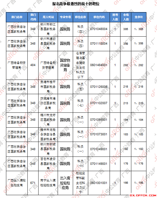 截止到20日16時(shí),競爭比例的職位為柳州市柳江縣國家稅務(wù)局科員(四)一職,招錄1人,通過人數(shù)為385人,競爭比例385:1!
