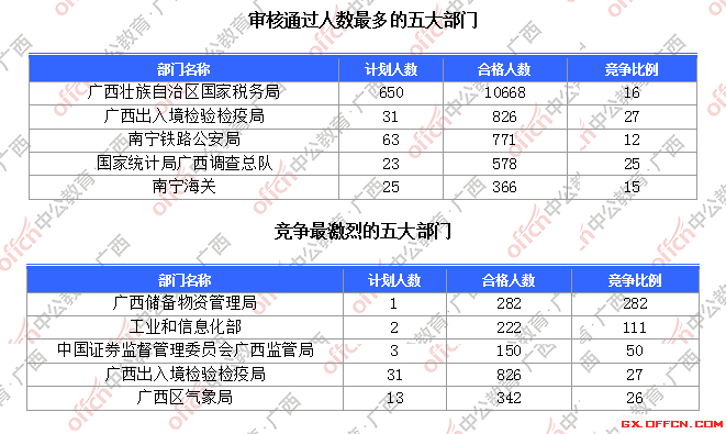 為幫助廣大考生更清晰的了解今日?qǐng)?bào)名情況,廣西中公網(wǎng)校整理了審核通過人數(shù)前五位的部門以及競爭比例最激烈的五大部門,供廣大考生參考: