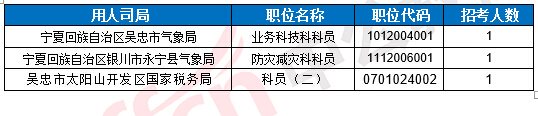 截止到20日16時(shí),工作地點(diǎn)在寧夏的職位共有3個(gè)無(wú)人報(bào)考。下面是無(wú)人報(bào)考職位一覽表,中公網(wǎng)校專家建議廣大考生多關(guān)注一些較冷職位,避免激烈競(jìng)爭(zhēng),結(jié)合自身?xiàng)l件,找到屬于自己的職位。